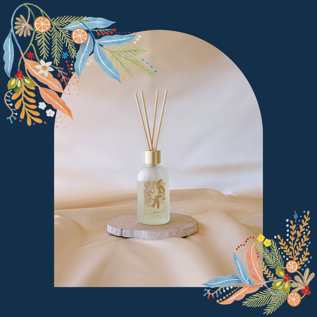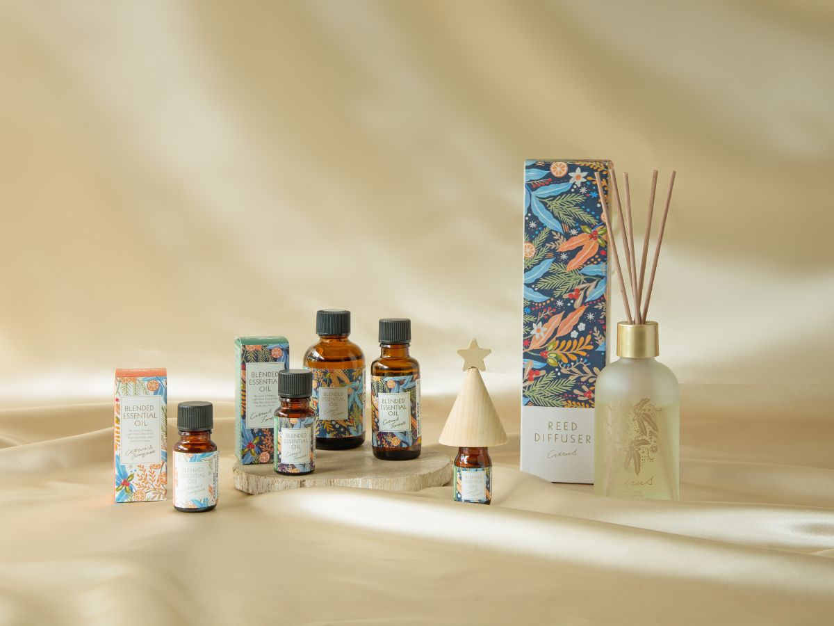冬らしく暖かみを感じる2種類の香りのブレンド精油に、今年はツリー型のアロマキャップセットが新登場。爽やかなシトラスが香るリードディフューザーも新たな装いに。